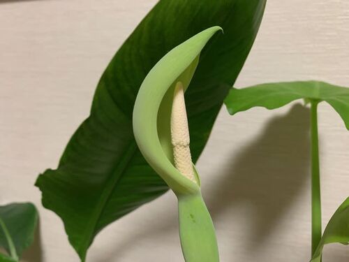 寝室で育てている観葉植物のクワズイモに花が咲きました クワズイモに花が咲くことにびっくりですが、この花甘い香りのするで部屋中が アロマ焚いてるみたいでいい匂いがします やがて種になるらしいのでじっくり観察していきます